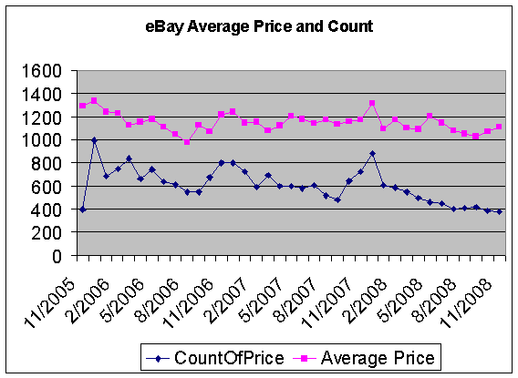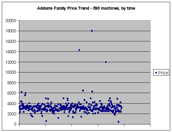 This eBay sales summary has been collected from successful eBay pinball machine sales over the last 36 months (November 2008). This summary represents 22,458 machines sold on eBay during that time period. The list is hand compiled, so there may be errors or omissions. The list should only be used as a guide to value, and does not represent the condition of the machine The list starts below the two graphs.
